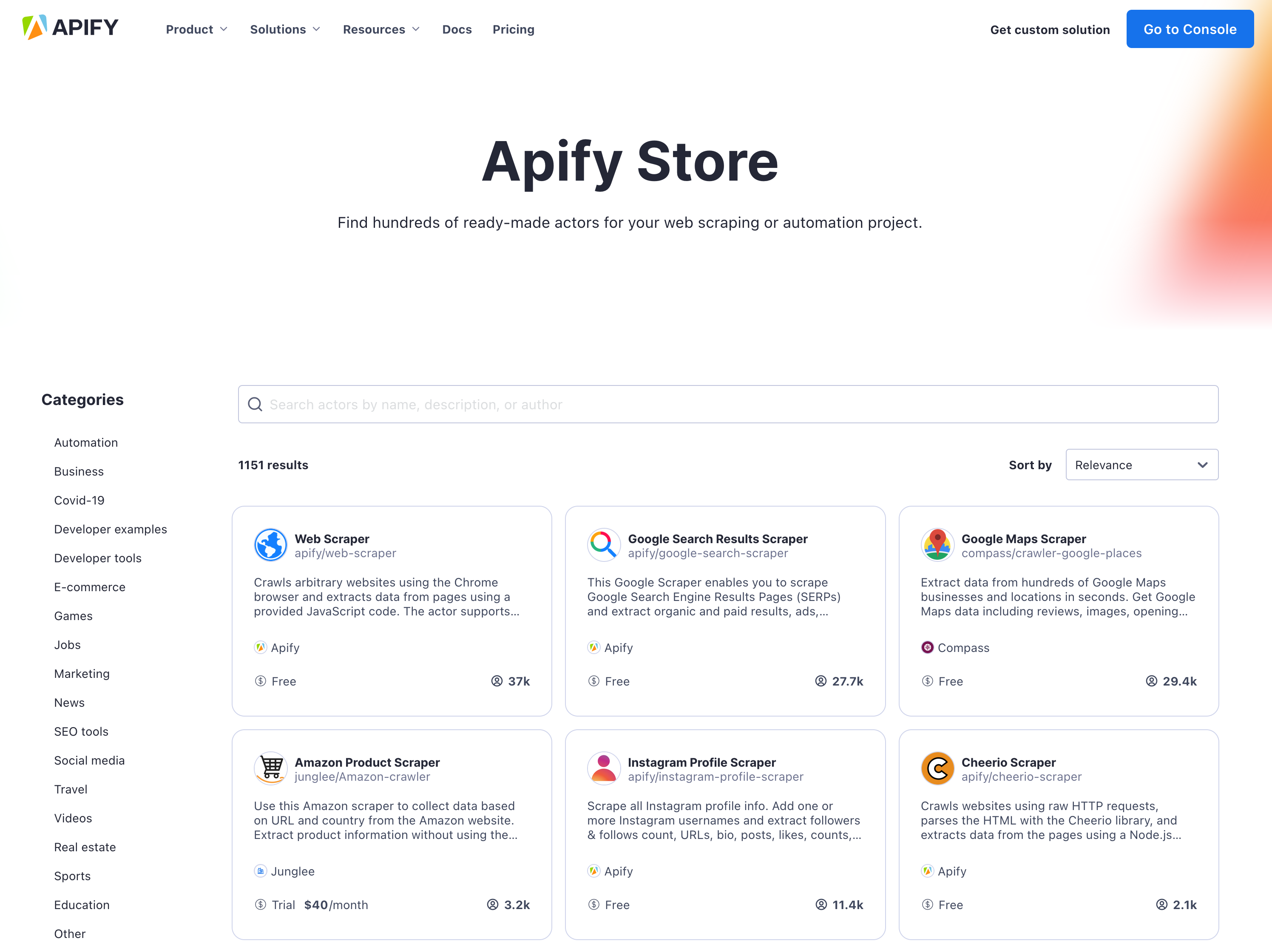 - The Actor ideas page to find Actors in demaed by the Apify community